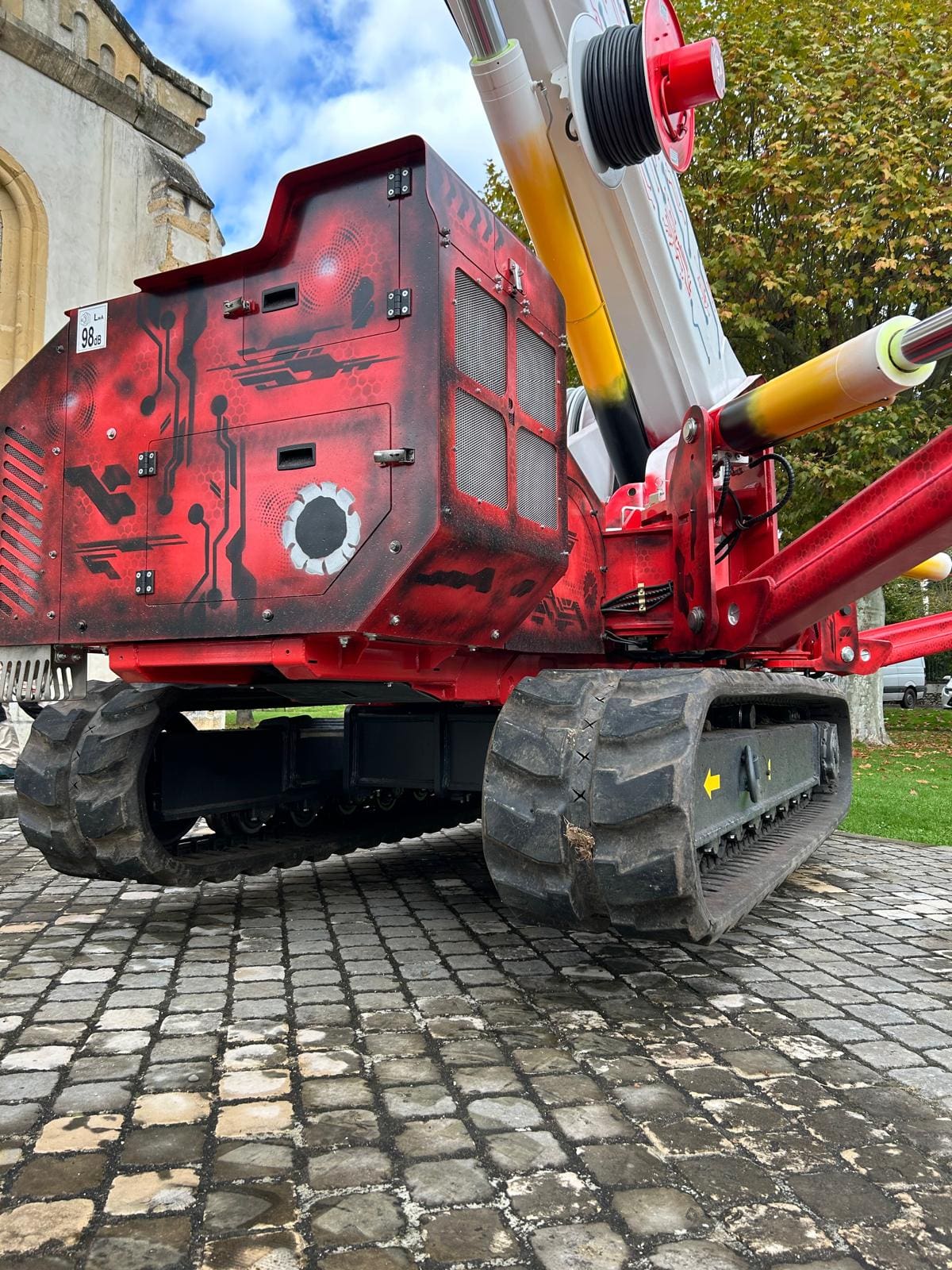 2m54 m de haut, 1m45 cm de large pour 14900 Kg, permettent à cette grue araignée d’entrer par une simple porte, pour ensuite évoluer dans un espace réduit, tels que gymnases, églises, entrepôts, églises ou encore centres commerciaux…